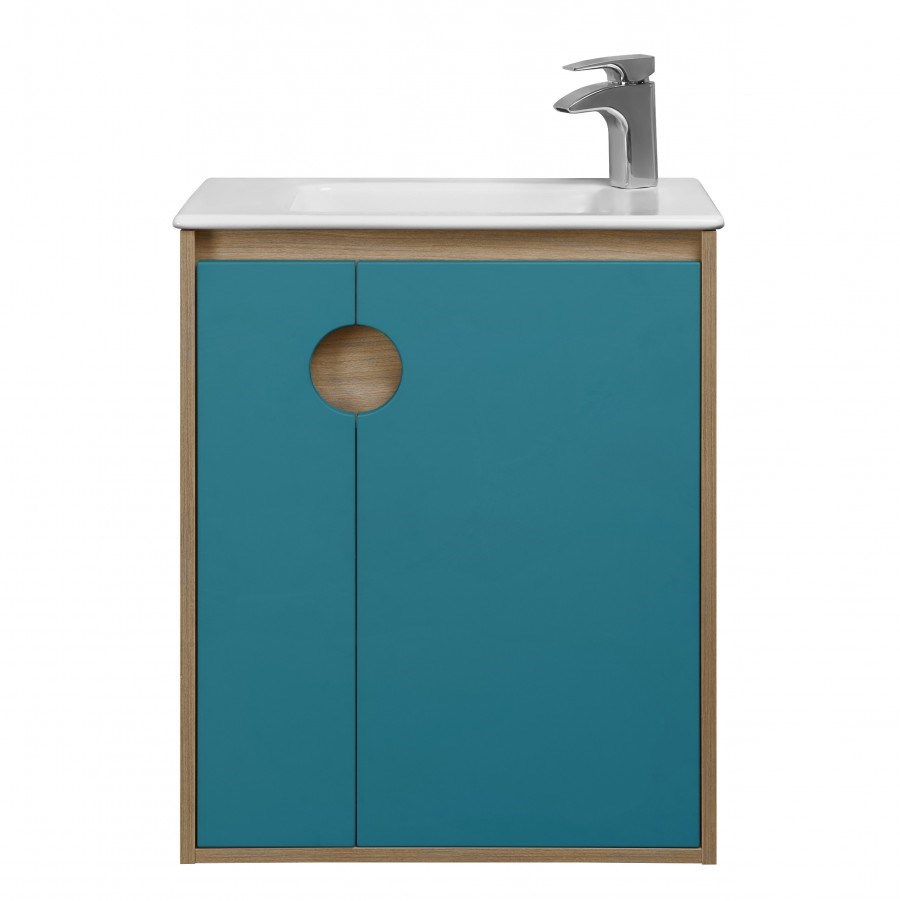 Тумба "Анси» подвесная, с распашными дверками выполнена в современном минималистичном стиле. Роль ручек играют круглые отверстия, которые придают мебели оригинальный вид. Тумба совместима с раковиной Debba, скрывает коммуникации и не затрудняет доступ для их осмотра. Корпус тумбы изготовлен из ДСП (древесно-стружечной плиты), покрыт полимерной меламиновой пленкой, устойчивой к влаге и механическим повреждениям. Благодаря матовой фактуре на покрытии незаметны разводы и следы от капель воды. Цвет - синий (боковины древесные). Особенности тумбы "Анси»: благодаря лаконичному дизайну выглядит гармонично и стильно в современном интерьере ванной; снабжена системой плавного закрывания дверок, которая обеспечивает их бесшумную и мягкую работу; укомплектована регулируемой внутренней полкой, которую можно установить на любой удобной высоте.