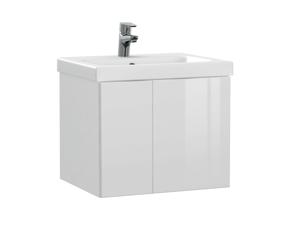 Белые глянцевые фасады, четкие геометрические формы тумбы помогут создать минималистичный и строгий интерьер ванной комнаты.