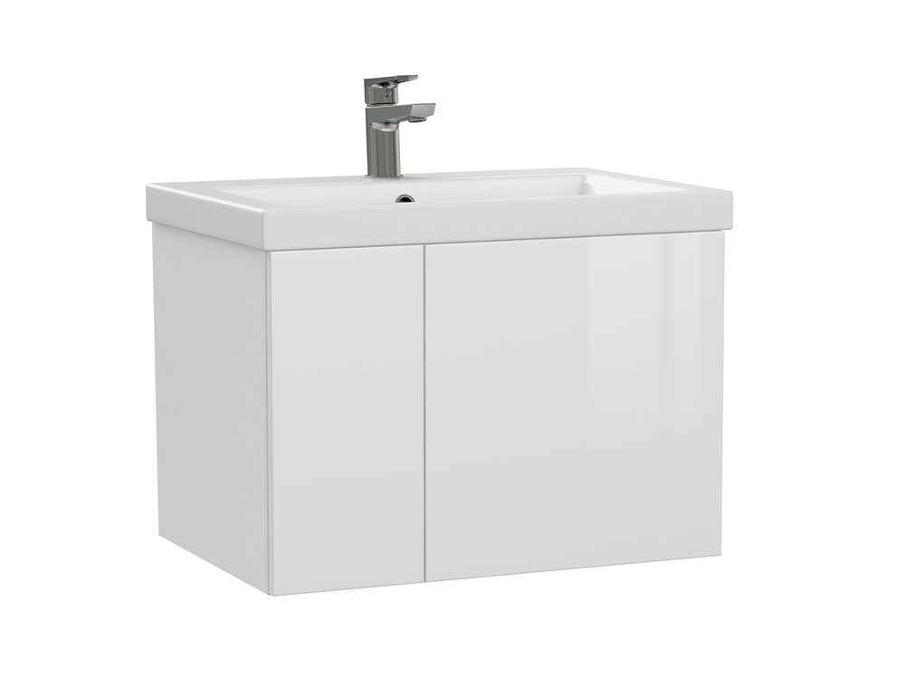 Белые глянцевые фасады, четкие геометрические формы тумбы помогут создать минималистичный и строгий интерьер ванной комнаты.