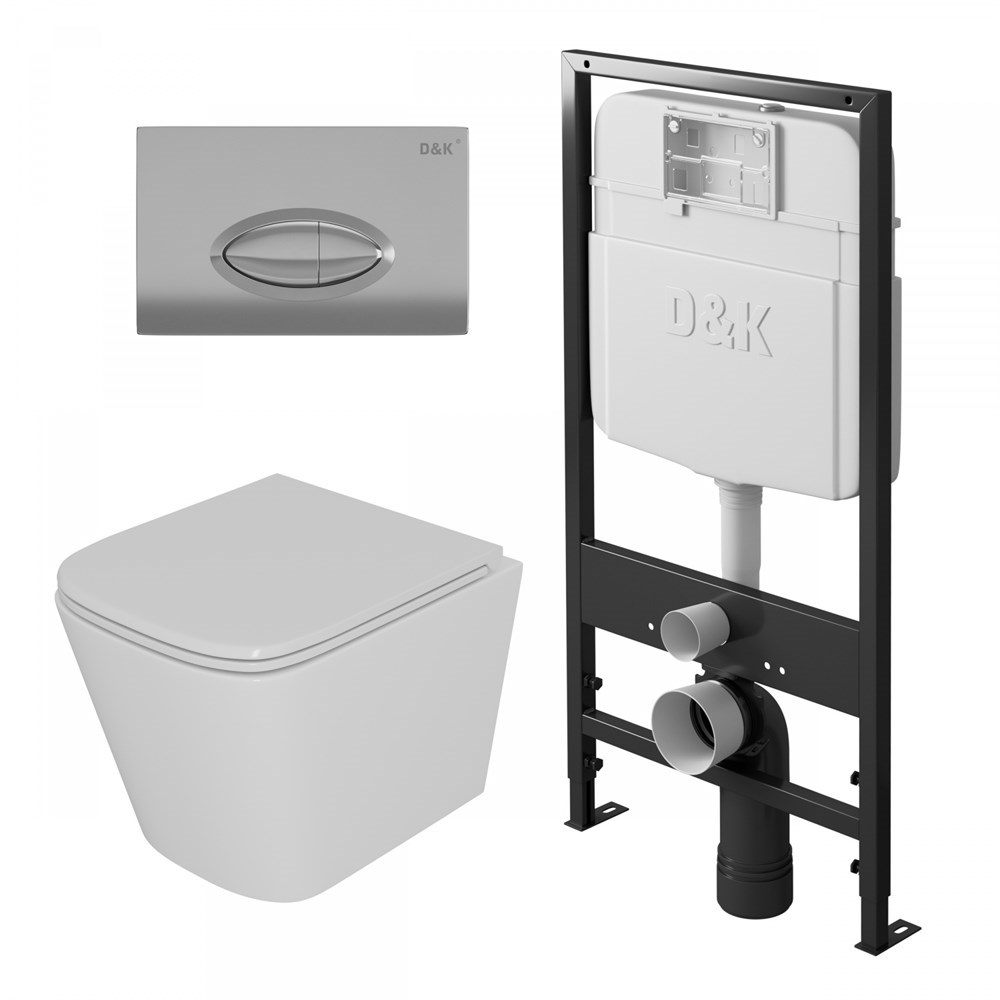 Комплект Унитаз подвесной безободковый D&K Berlin DT1436016, 490*340*350мм, сиденье микролифт, белый+Инсталляция рамная скрытого монтажа D&K DI8055119, 550*100*1190мм, для подвесного унитаза, универсальная+Клавиша смыва D&K Rhein.Marx DB1399001, хром