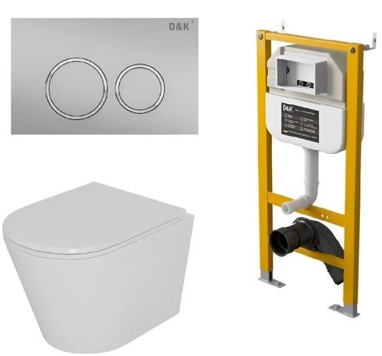 Комплект Унитаз подвесной безободковый (торнадо) D&K Venice DT1026516, 515*355*365мм, сиденье микролифт, белый+Инсталляция рамная скрытого монтажа D&K DI8050127, 500*117*1270мм, для подвесного унитаза, универсальная+Клавиша смыва D&K Bayern DB1529002, матовый хром