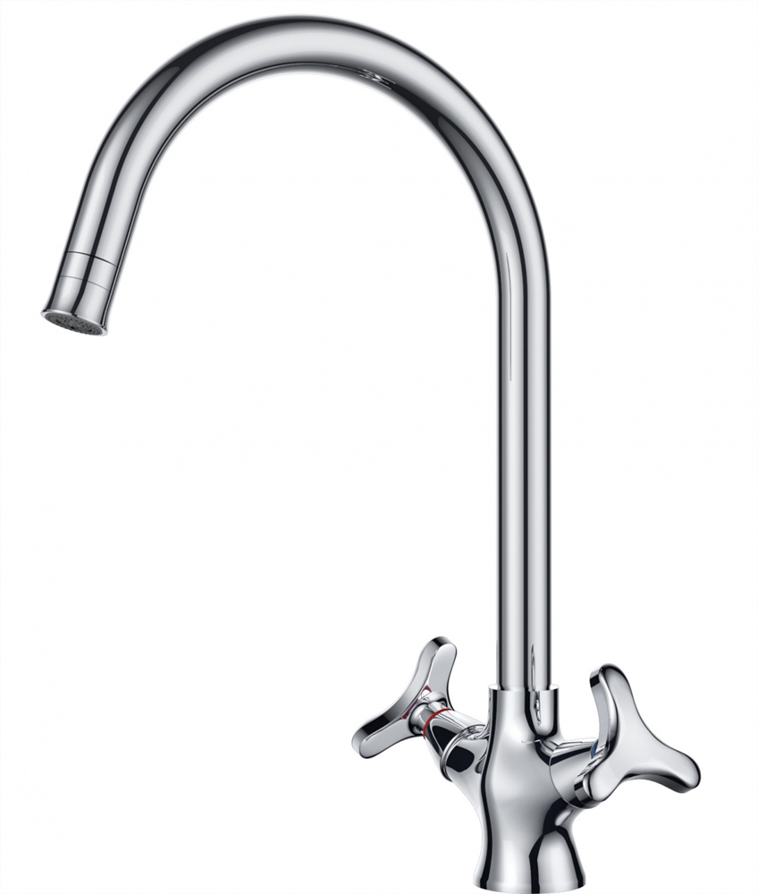 Блестящий внешний вид двухручкового смесителя с обновленными ручками привлекает своим внешним видом, послужит прекрасным дополнением классической кухни.