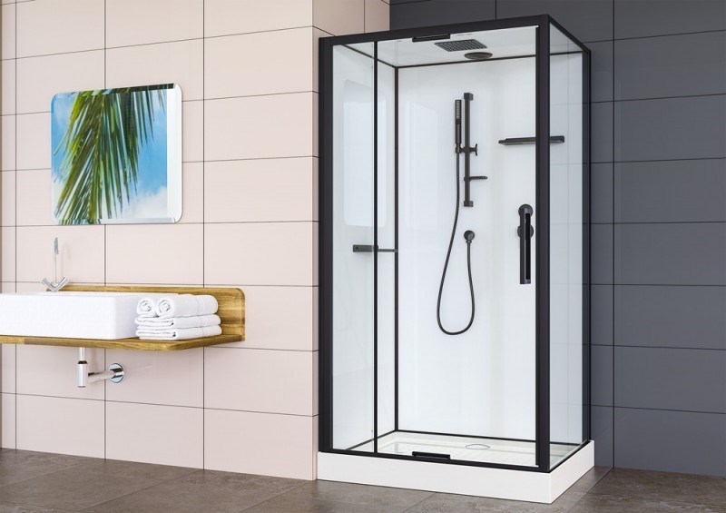 Низкий поддон. Сифон 90мм с гидрозатвором. Полураспашная прозрачная дверь с покрытием Easy Clean (6 мм).Задние стенки - "супербелое" крашенное стекло (5мм). Профиль алюмииевый (черный матовый). Замковое соединение профилей. Ручная лейка из ПВХ и шлангом из ПВХ (длина 1,5 м) чёрного цвета. «Интегрированное» зеркало на задней стенке кабины. Душевая лейка. Дверные петли из латуни. Крыша - "супербелое" крашенное стекло (6мм), покрытое защитной плёнкой. Верхний душ из ABS чёрного цвета.