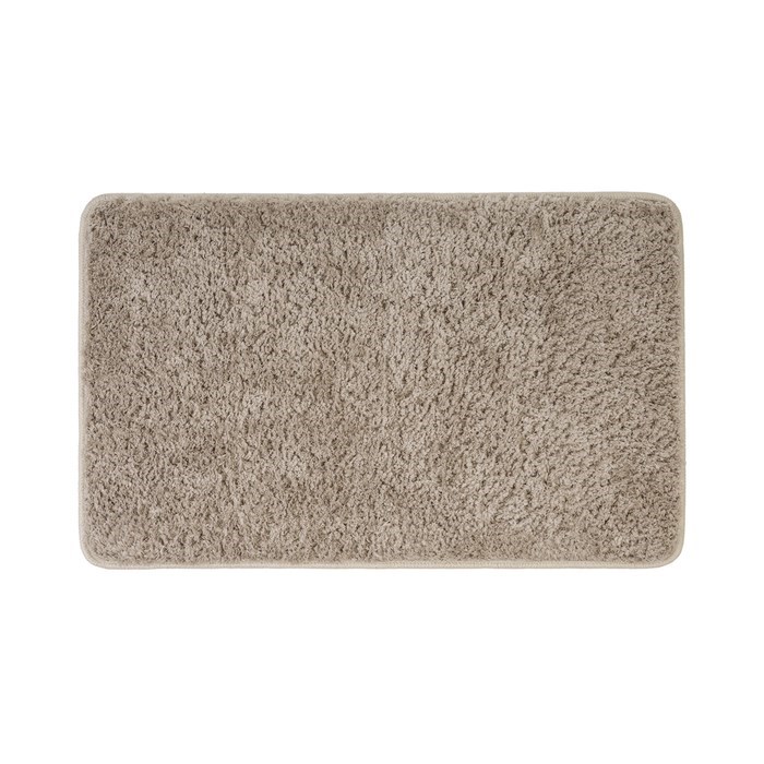 Мягкий коврик для ванной светло-коричневого цвета с плотным высоким ворсом (2 см), очень приятный на ощупь. Стриженый ворс из микрофибры отлично держит форму, легко чистится и быстро сохнет. Коврик подойдет для ванной и туалета.