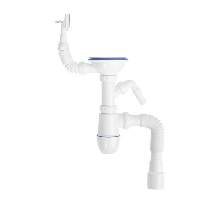 Сифон бутылочного типа для мойки на кухню с переливом. Продуманная конструкция с учетом всех мелочей: отдельный отвод для посудомоечной машины, в комплекте гофрированные отводы для удобства подключения.