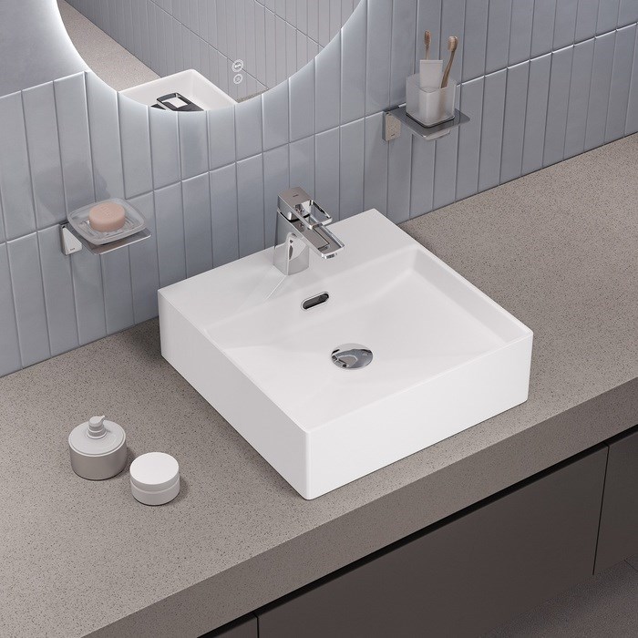 Стильный умывальник Bild для ванной комнаты актуального лаконичного дизайна с удобной полочкой подойдёт к любому современному интерьеру. Размер 420х420х130 мм. Два варианта установки: подвесной и настольный.