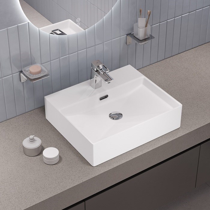Стильный умывальник Bild для ванной комнаты актуального лаконичного дизайна с удобной полочкой подойдёт к любому современному интерьеру. Размер 500х420х130 мм. Два варианта установки: подвесной и настольный.