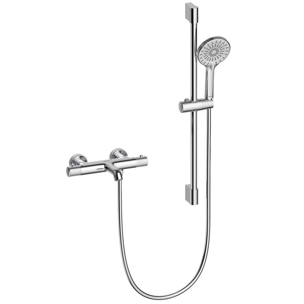 КомплектацияКорпус смесителя с монолитным изливом с аэратором, термостатическим картриджем, 3-позиционным картриджным переключателем с керамическими пластинами и металлическими рукоятками, стойка для душа, держатель душевой лейки, 3-функциональная душевая лейка, душ