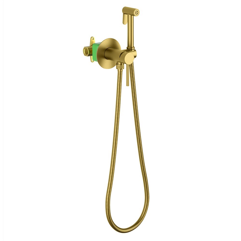 КомплектацияСмеситель скрытого монтажа с подключением шланга гигиенического душа - 1 шт. Декоративная накладка смесителя (латунная) - 1 шт. Ручка управления смесителем - 1 шт. Шланг душа (латунный) 1,2 м - 1 шт. Гигиеническая лейка (латунная) - 1 шт. Инструкция - 1 ш