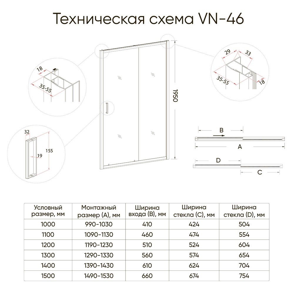 VECONI Душевая дверь раздвижная Vianno VN-46BC, 1200x1950, Никель брашинг, стекло прозрачное
